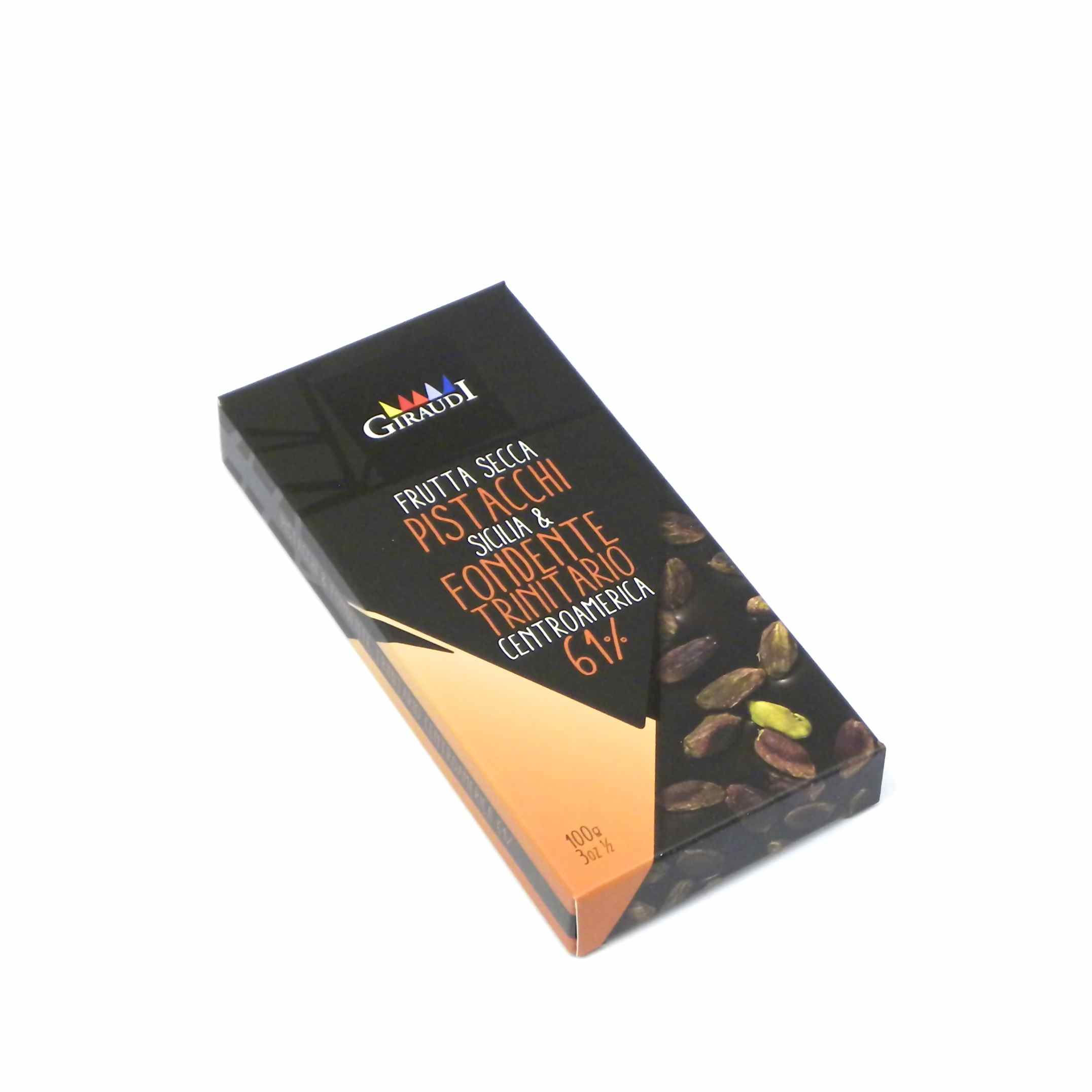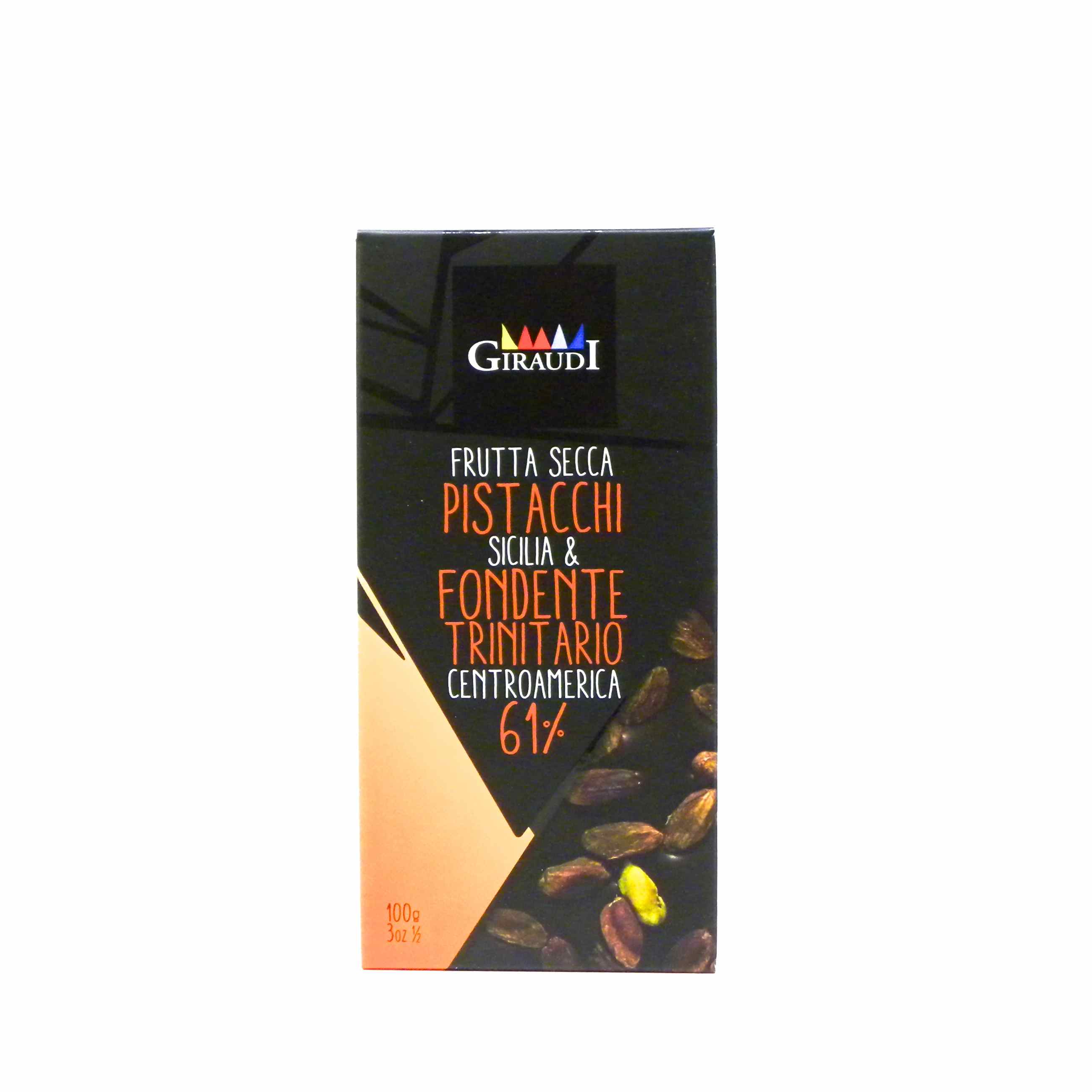 In the 61% Dark Chocolate bar with Sicilian Pistachios, whole Sicilian Pistachios are surrounded by a blend of fine cocoas, for a delicious balance of tastes.